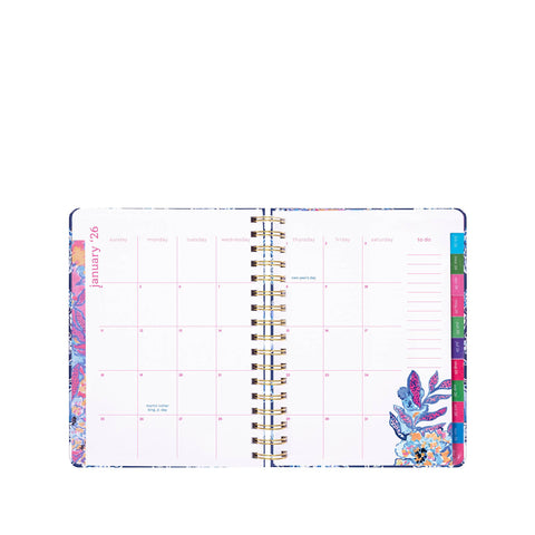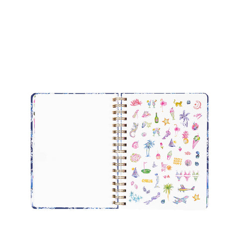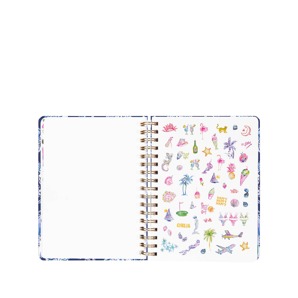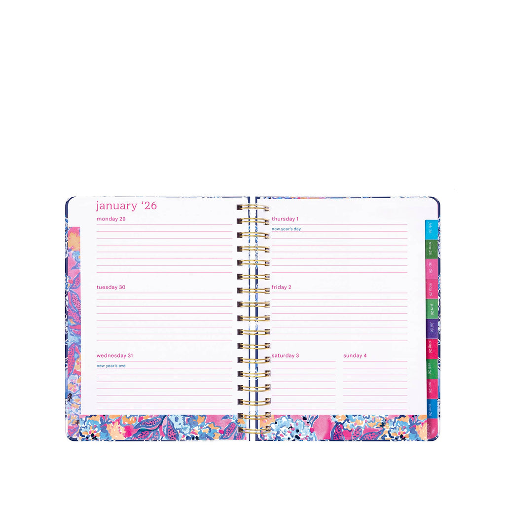 Make plans in print with Lilly's large 2025-2026 hardcover, spiral bound agenda in Sapphire Pool Barefoot Beachcomber. It includes monthly and weekly views for keeping track of every vacation, appointment, playdate, date night, and brunch with your BFFs. Even better, it's delightfully designed with two sticker pages, handpainted art interiors, a reinforced double-sided interior pocket, tabs, gold elastic band closure and spirals, and smooth pages full of colorful prints.